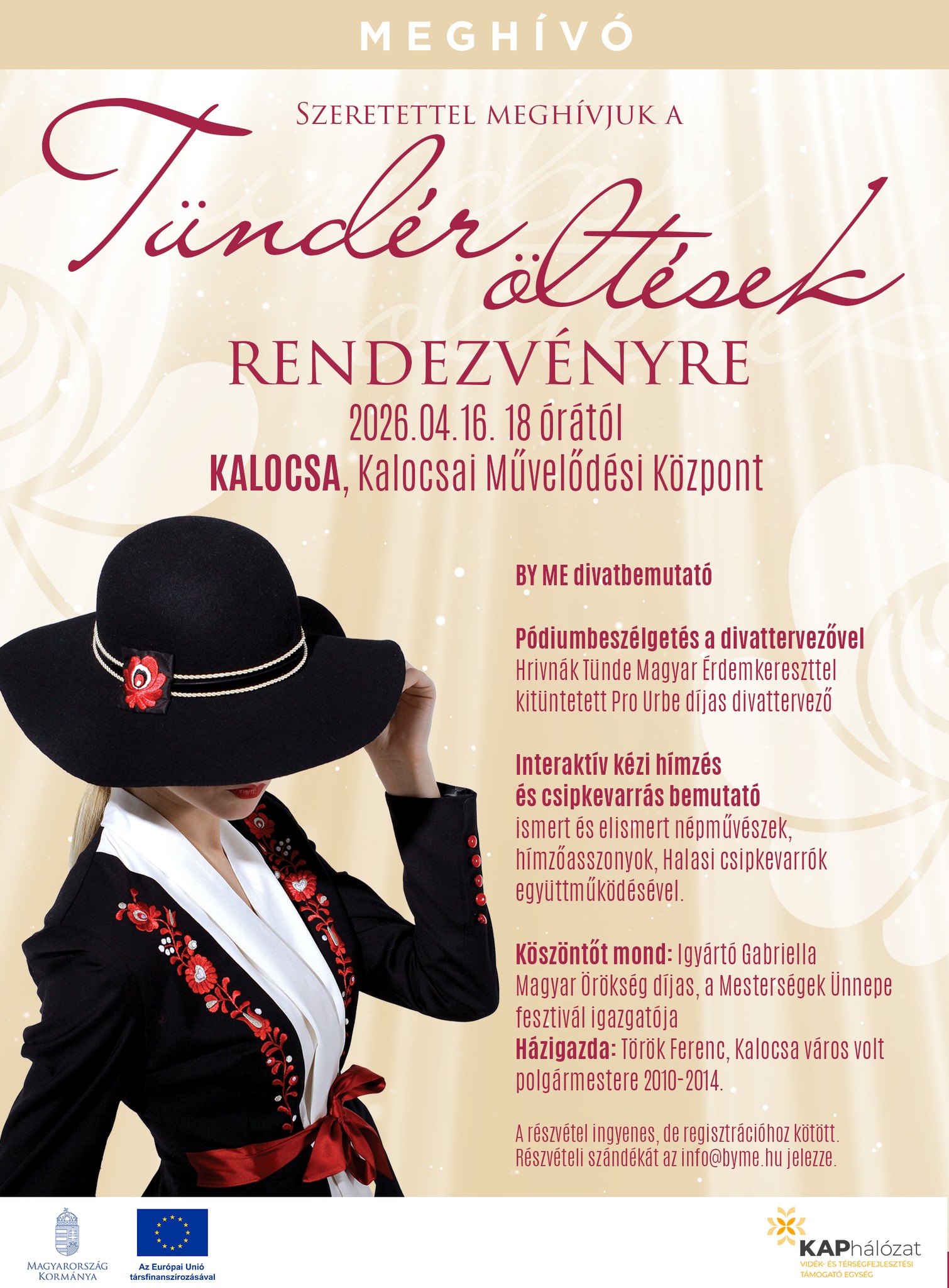 A rendezvényen BY ME divatbemutatót is láthat a közönség, emellett interaktív kézi hímzés- és csipkevarrás-bemutatóval is készülnek a szervezők. A programban ismert népművészek, hímzőasszonyok és halasi csipkevarrók is közreműködnek, akik betekintést adnak a hagyományos kézműves technikák világába.